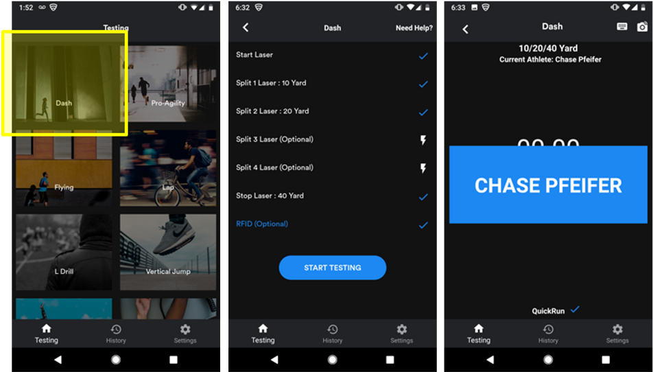 Dashr’s RFID technology allows for fully automated hands-free testing. Simply check in all your athletes, set up your drill(s), and place your phone(s)/tablet(s) on their tripod. Athlete steps up – bumps their band against the RFID module – their name pops up on the screen – complete the test – next athlete up! No interaction with the app is necessary. This is ideal for teams or trainers that test often or use the system for training.