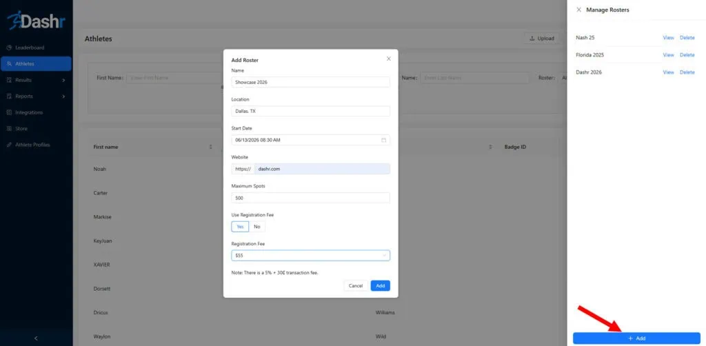 Finally, you can set your registration fee and press “Add” to create the roster. Note that there is a 5% + $0.30 fee for each transaction. This transaction fee comes out of the athlete’s payment to you. For example, if you charge a $55 registration fee you will be paid $51.95 per registration.