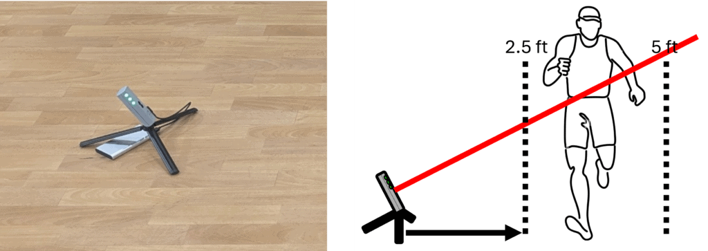 - Each Silver laser comes on a mini tripod angled up. Take one out of the case and place it on the ground where you are running the drill. Place the Silver laser on the ground and point it down the line you wish to time off of. Ensure that you have a 10 yard space for the drill along with an appropriate run-out space.